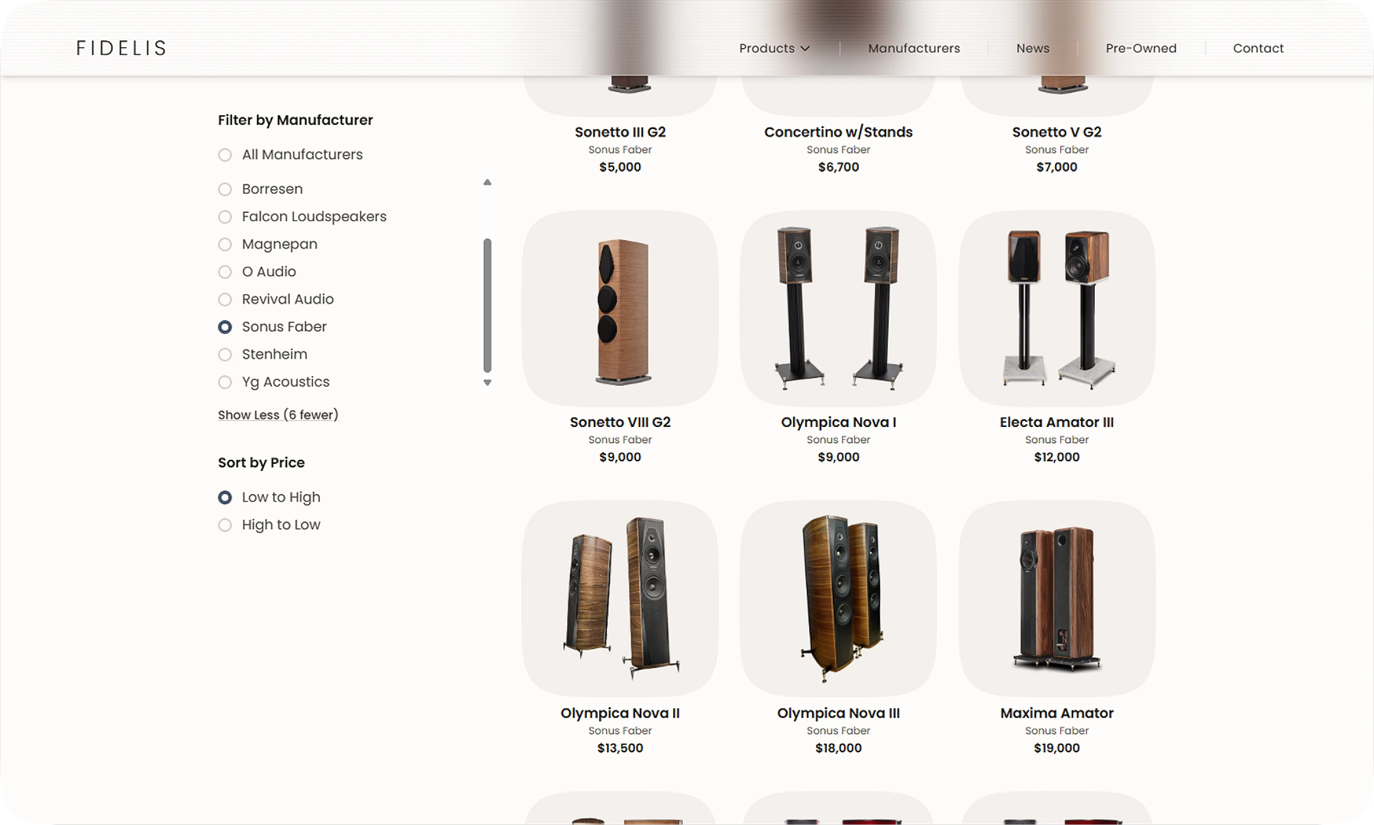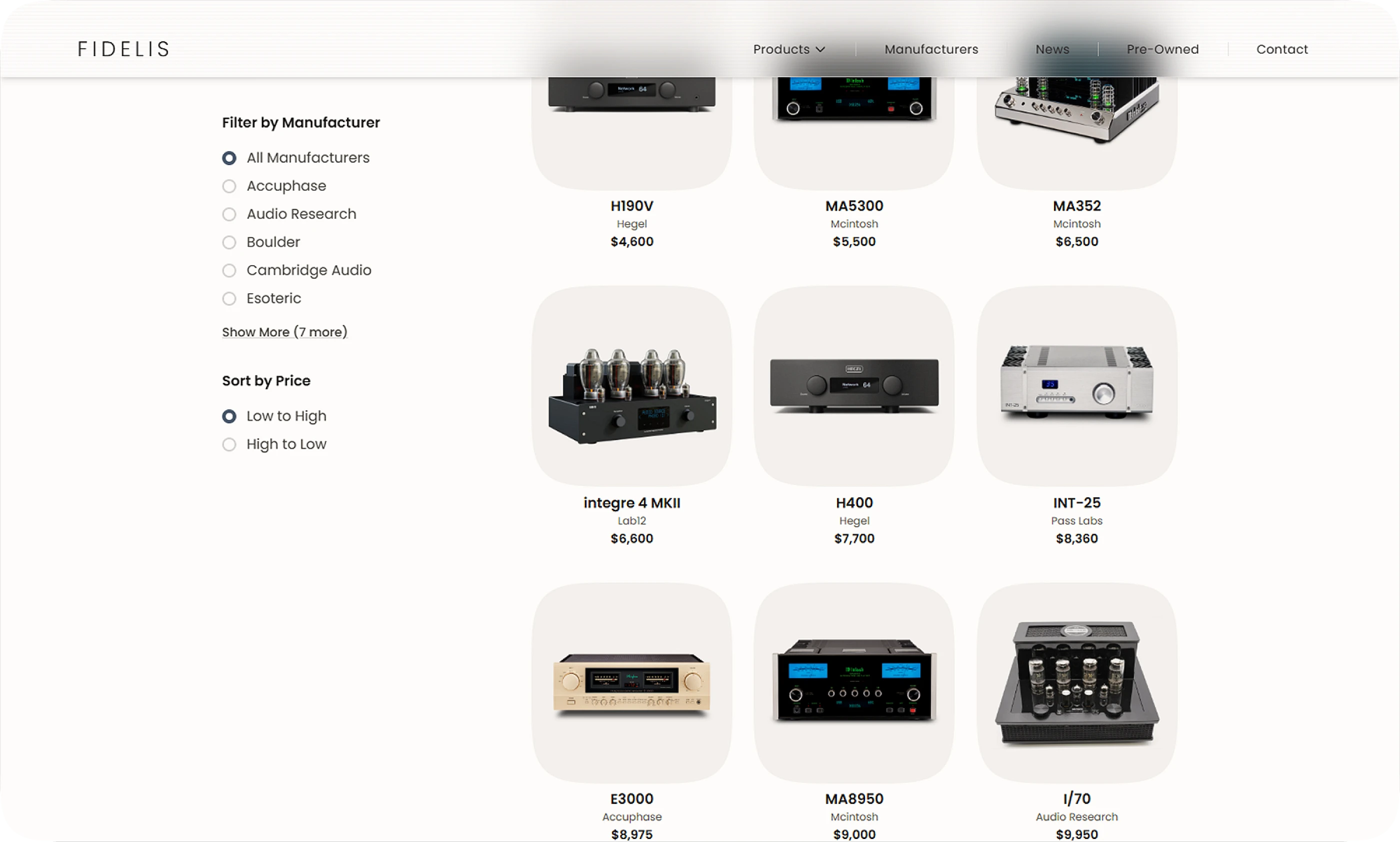 Fidelis is America's #1 importer and distributor of high-end audio equipment. Using Claude-4-Sonnet AI in Cursor, I 'vibe-coded' a redesign and rebuild of their customer-facing site, reconceived as a responsive React app. Custom in-app CMS, enhanced sort and filter functionality, improved UX/UI, use of animation, and 100/100 SEO scores.