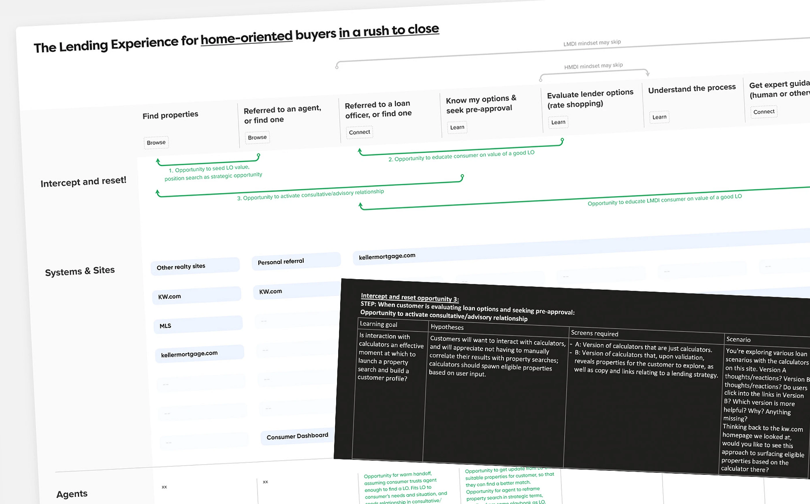 Keller Williams is the world's largest realty company. I led a team of researchers and designers to bootstrap their new Mortgage platform from inception through launch (and subsequent sale when Keller exited the market in response to wider economic conditions). Our 'Lean Startup' process allowed us to hone in on a strategy of financial empowerment for prospective homebuyers, creating a suite of best-in-class tools and offering a 'soft-sell' approach. Crucially, we chose 'qualified leads' over merely 'leads' as our core success metric, which ensured all downstream UX work focused on building rich relationships between prospective homeowner, Loan Officer and Agent.