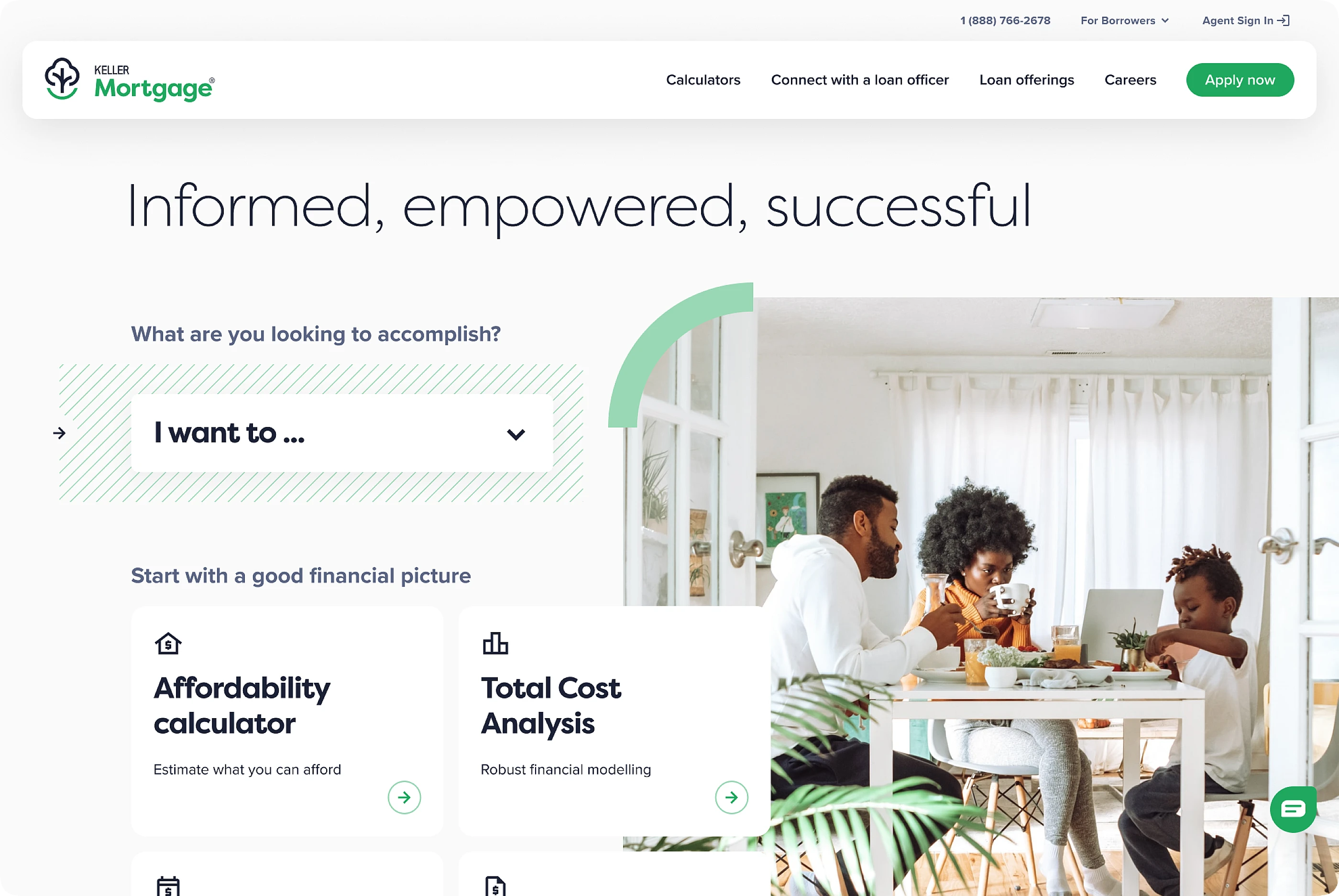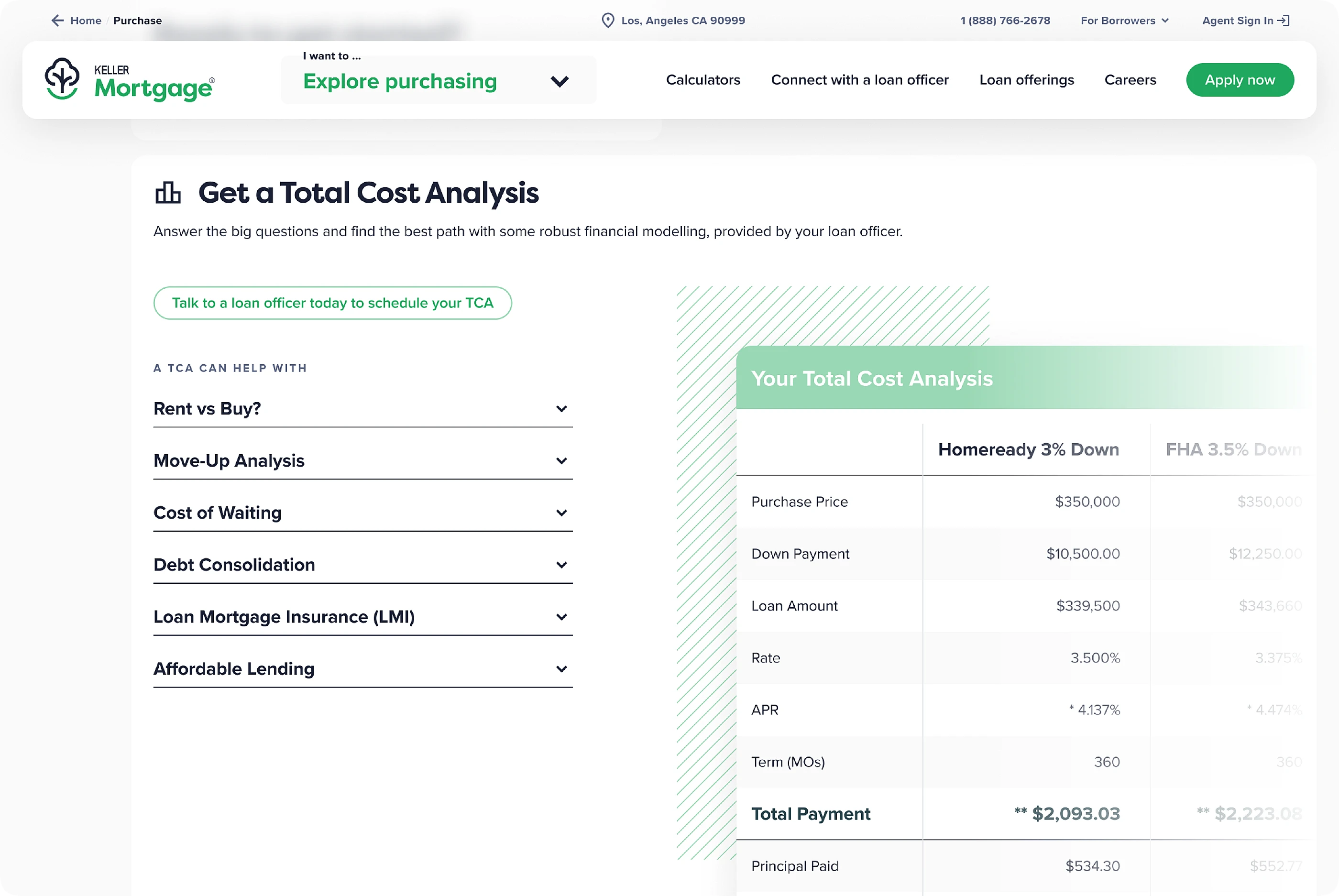 Positioning Keller Mortgage as more of a ‘suite of tools’ to help prospective homeowners, rather than taking a traditional ‘hard sell’ approach, we prominently featured a ‘Total Cost Analysis’ tool. Capturing even initial clicks into the various parameters, such as ‘Rent vs Buy?’, we were able to deepen conversations between customers and their Loan Officers and Agents.