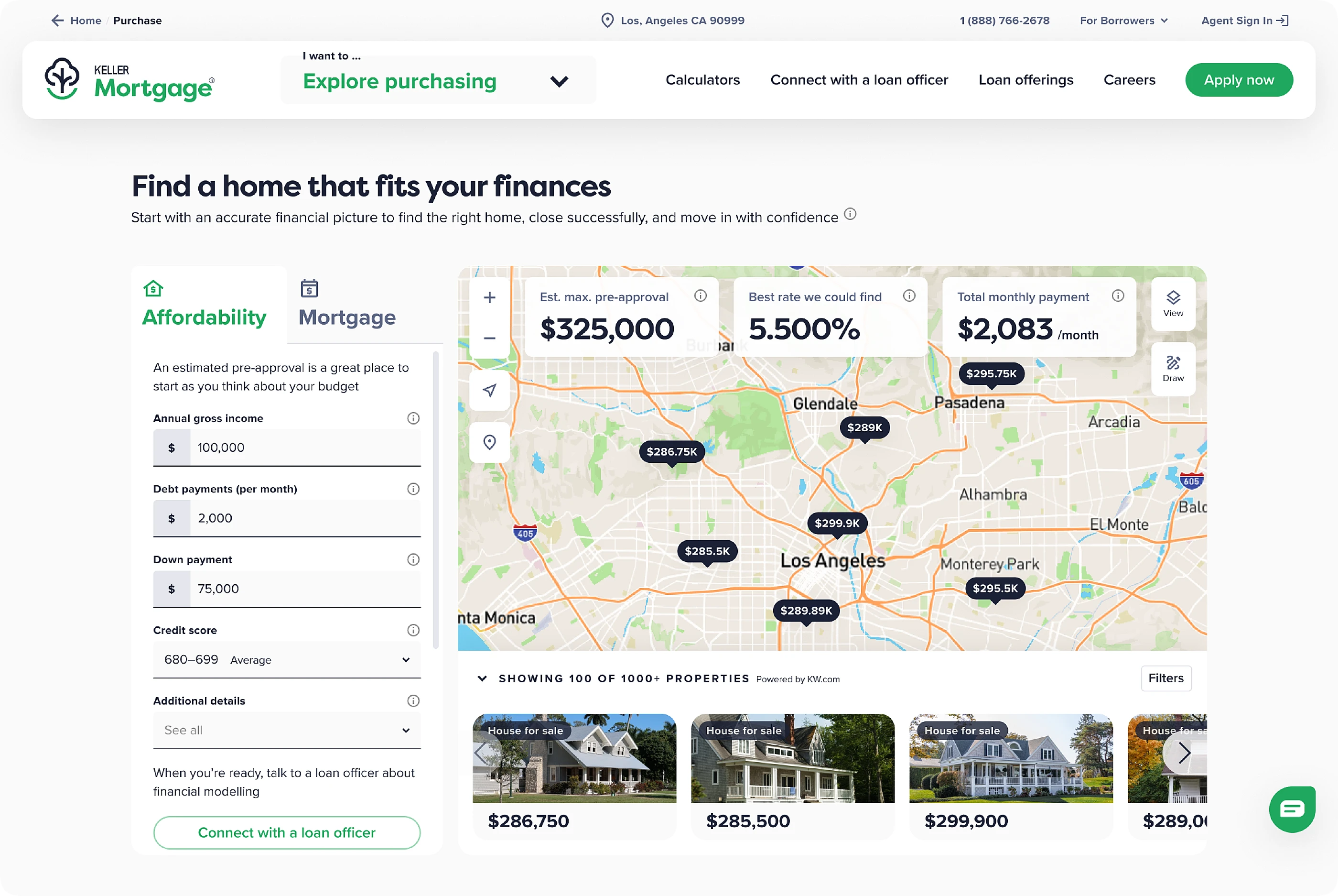 In an innovative industry-first, we designed a way to discover potential properties driven by affordability and mortgage calculators, which typically exist in isolation. This search could be captured and shared with both Loan Officer and Agent. The likelihood of successful closing was higher with these more calibrated expectations in place.