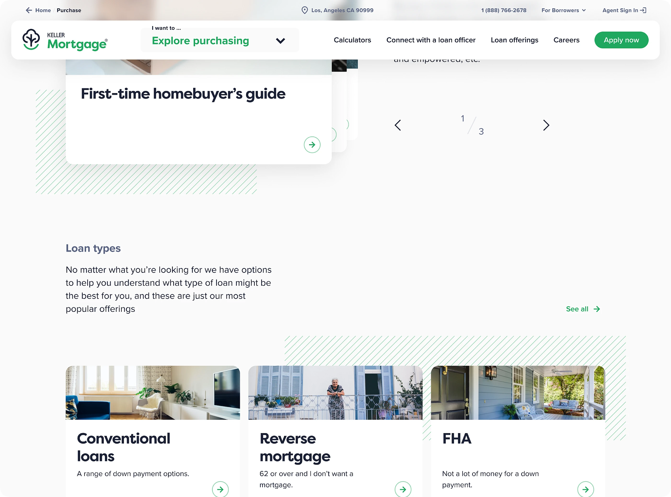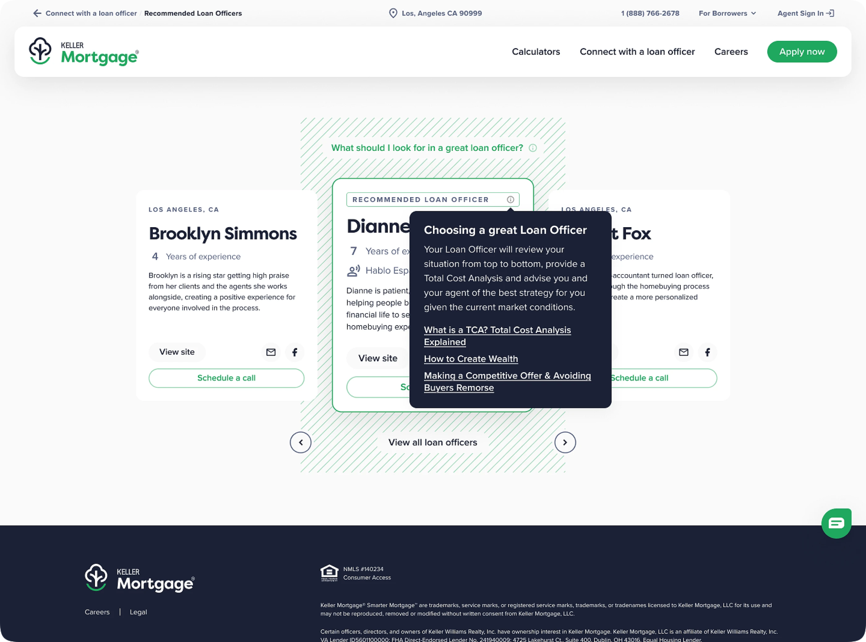 Patterns such as this helped users not only select a Loan Officer to work with, but also seeded the concept of basing their homeownership journey in the context of wider financial planning. Through multiple rounds of testing over a year and half of development, this unique strategy was validated as remarkably effective in both winning customers in a crowded market, while reducing barriers to the dream of homeownership for thousands of customers.