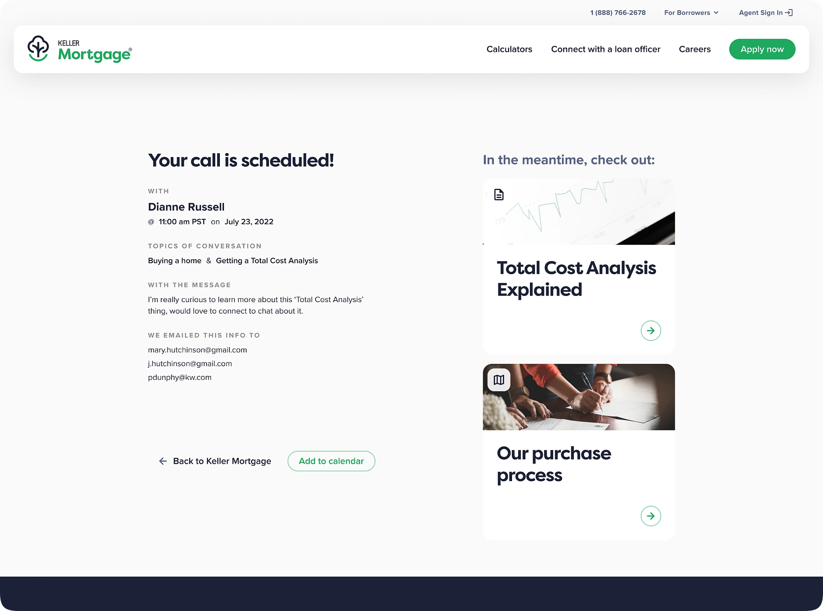 We surfaced personalized educational materials at contextually meaningful moments such as on a success screen after a customer sets up a call with their new Loan Officer.
